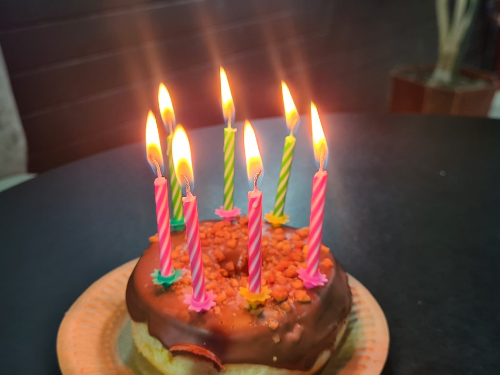 Apoi am mers la locația cu gogoși. La Gogosh Sibiu. Am comandat o gogoașă Snickers, preferata mea, am pus câte lumânări am reușit și apoi am cerut domnului de la bar o brichetă. Cu mențiunea că lumânările nu vor sta aprinse mai mult de 30 de secunde. Le-am aprins repede, am zis în gând: SĂ FIU FERICITĂ și am suflat cât de tare am putut. Le-am stins pe toate. Dar oare este suficient să ai niște plămâni puternici pentru a-ți îndeplini dorințele?